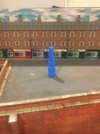 The next step involved sorting a roof and then dealing with the blue. The roof was done with a couple of sheets of 0.5 plasticard and the bricks were sourced from Scalescenes (their London Brick option for the Scratch Builders Yard). As my wife is into paper crafts and scrapbooking, she has a large range of suitable tools for working with paper so one evening while she was out I availed myself of them. She also has a collection of inks for stamping designs and one of them was a good match for blending in the cut edges. The slate roof came from Shapeways too. D15 Shapeways print lurking in the doorway this time.